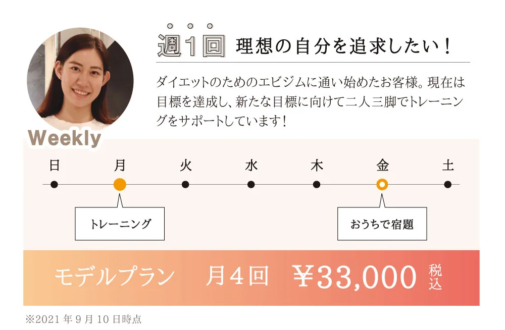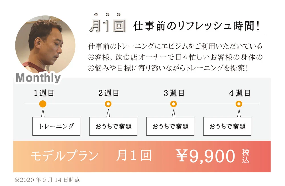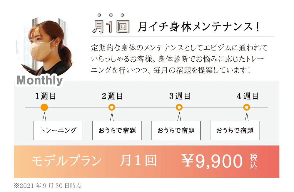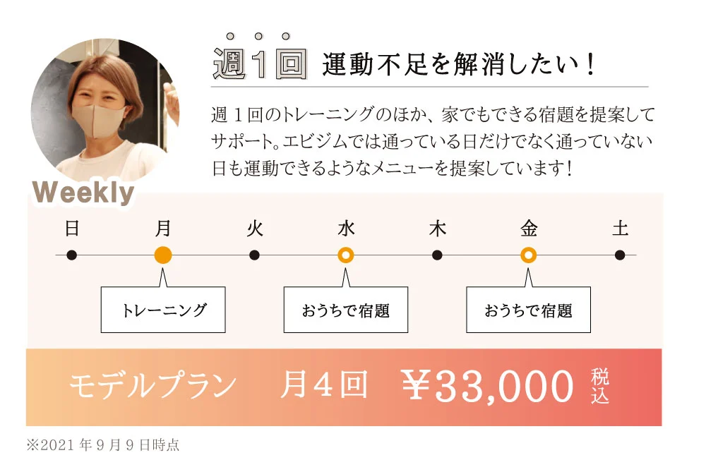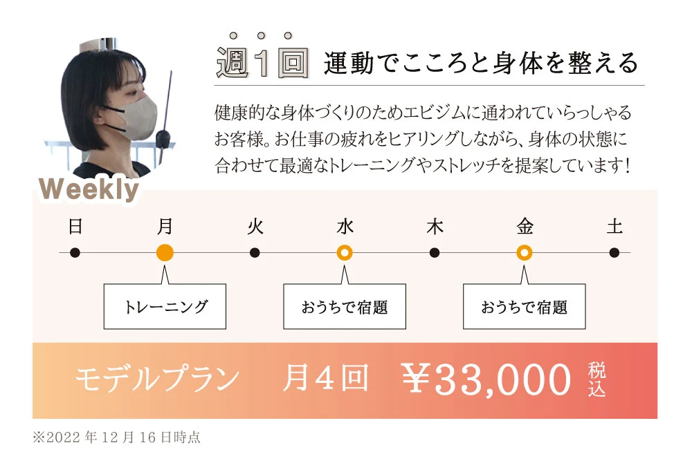 エビジムはパーソナルジムの中でも通いやすい料金プランです。お客様のライフスタイルに合わせて様々なプランを用意しているので、きっと自分にぴったりの通いやすいプランが見つかるはずです。