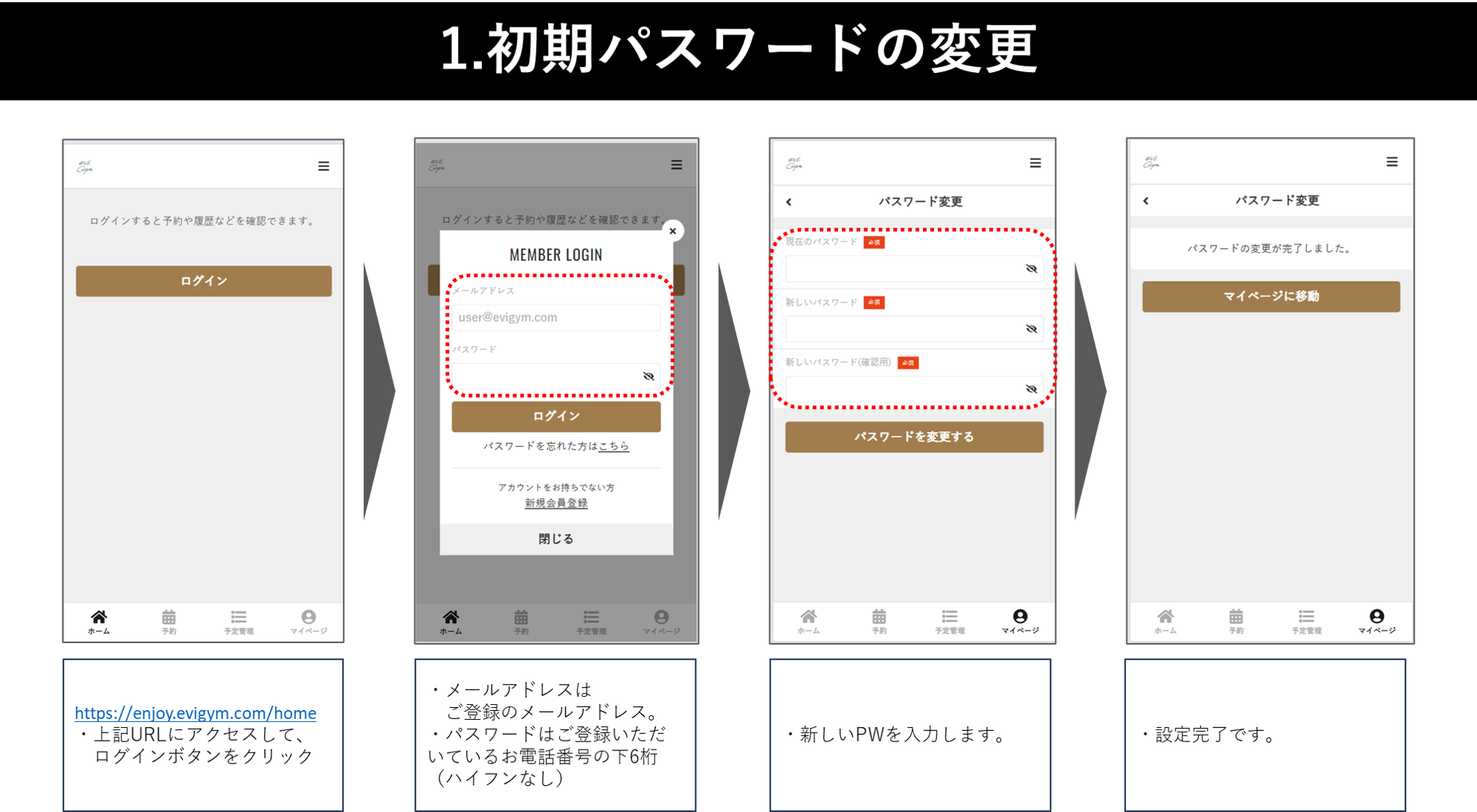 ・初期パスワードは、eviGymにご登録のお電話番号の下6桁に設定されています。